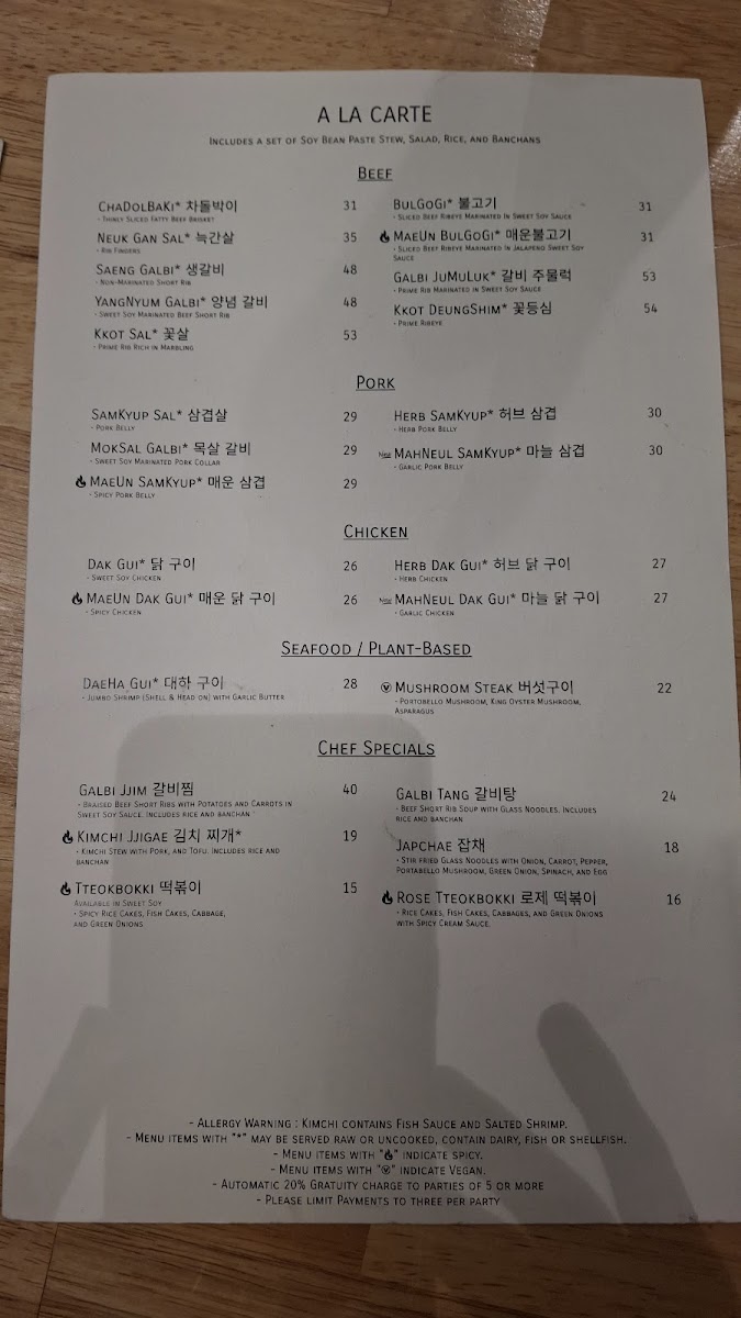 Marinated sliced beef ribeye, spicy marinated sliced beef ribeye, marinated pork collar, spicy pork belly, sweet soy chicken, spicy chicken. Served with banchan, soy bean paste stew, egg souffle, corn cheese, and rice
