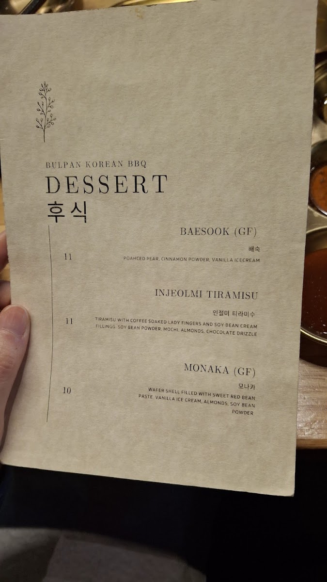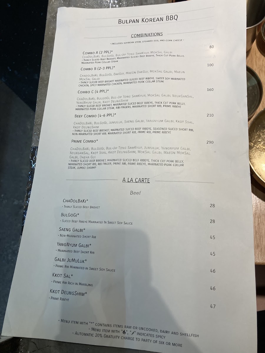 Thinly sliced fatty beef brisket, marinated sliced beef ribeye, prime rib, prime ribeye, marinated prime rib, non-marinated short rib, rib fingers, marinated short rib. Served with banchan, soy bean paste stew, egg souffle, corn cheese, and rice