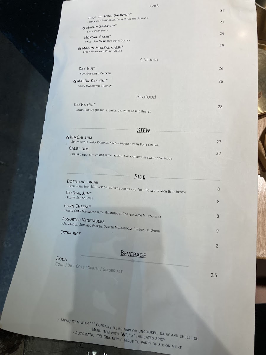 Thinly sliced fatty beef brisket, marinated sliced beef ribeye, pork belly, marinated pork collar, spicy pork belly, rib fingers, prime rib, prime ribeye, marinated prime rib, marinated short rib, jumbo shrimp. Served with banchan, soy bean paste stew, egg souffle, corn cheese, and rice